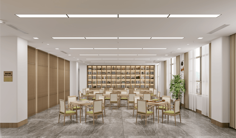 ▪ 文娱丰富:楼层内规划共享观景空间、阅览室、书画室、棋牌室、沙壶球室、手工艺室、健身房、情景小屋、心晴小屋、网吧及多功能厅,兼顾安静休憩与互动娱乐,丰富长者精神生活;