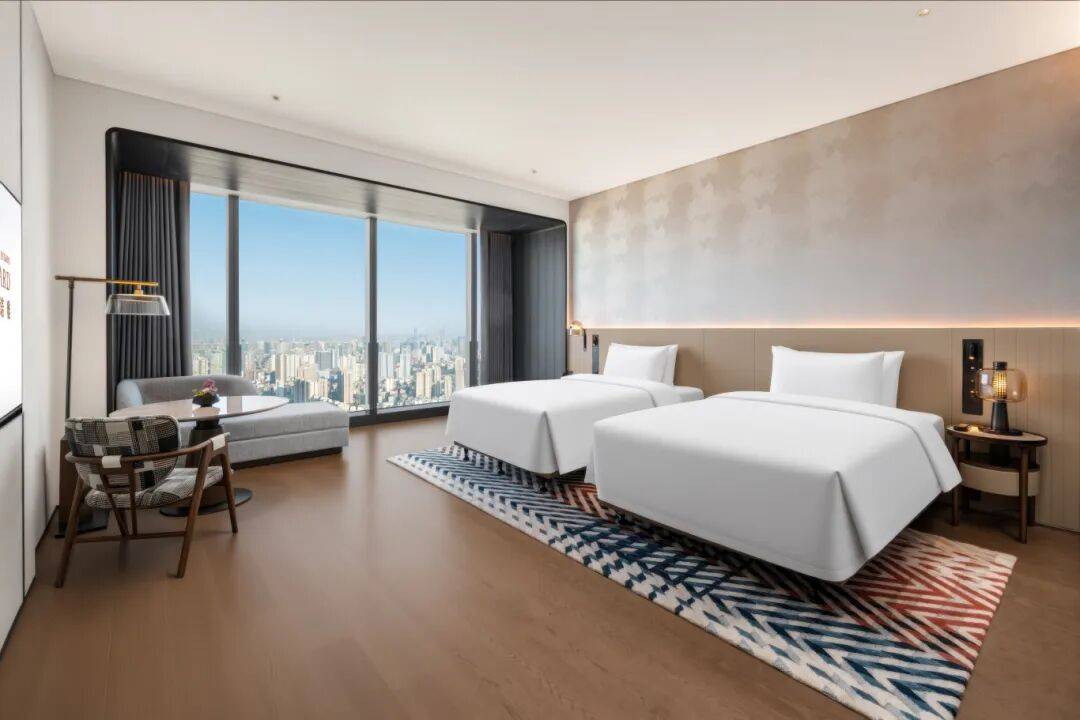 长沙岳麓万豪酒店于2025年7月9日开业,其坐拥旖旎的咸嘉湖及西湖风光,亦可远眺名胜岳麓山美景。其设计概念以“城市美术馆”为灵感,在延续万豪酒店现代设计美学的同时,将潇湘文化意象、岳麓山自然之美融入其中,以雅致的艺术品展现“潇湘竹韵”“岳麓枫红”的自然美学神韵,呈现湘江两岸的浪漫风流。