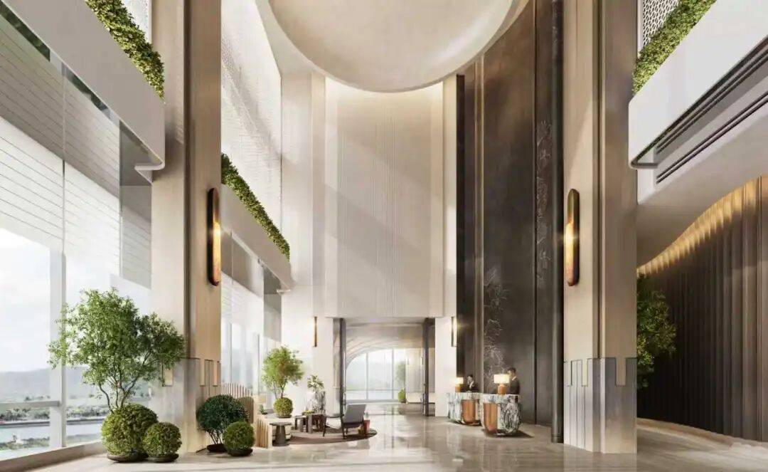 梅溪湖韦尔斯利酒店于2025年开业,位于长沙梅溪湖CBD中轴,坐落于风景如画的梅溪湖畔,毗邻城市岛公园。入口远离嘈杂的主车道,正面朝湖,加以绿植和格栅的围挡,更添一份隐秘感。通过入口处镂空陶砖过廊、独具特色的半轴实木大宅门徐徐打开,充满归家的仪式感。